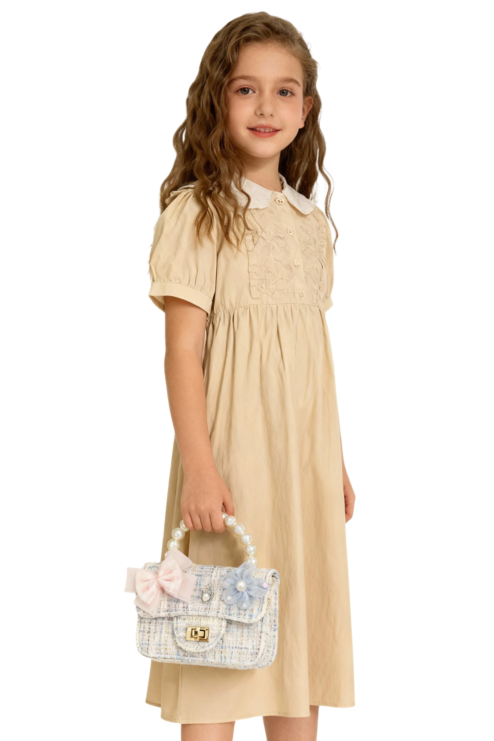 Este bolso de niña es la elección perfecta para quienes buscan un accesorio elegante, delicado y con un toque de fantasía para complementar cualquier look de fiesta o evento especial. Diseñado en un encantador tejido tweed en tonos beige con matices suaves, este bolso destaca por su combinación de estilo clásico y detalles modernos que enamoran a primera vista.