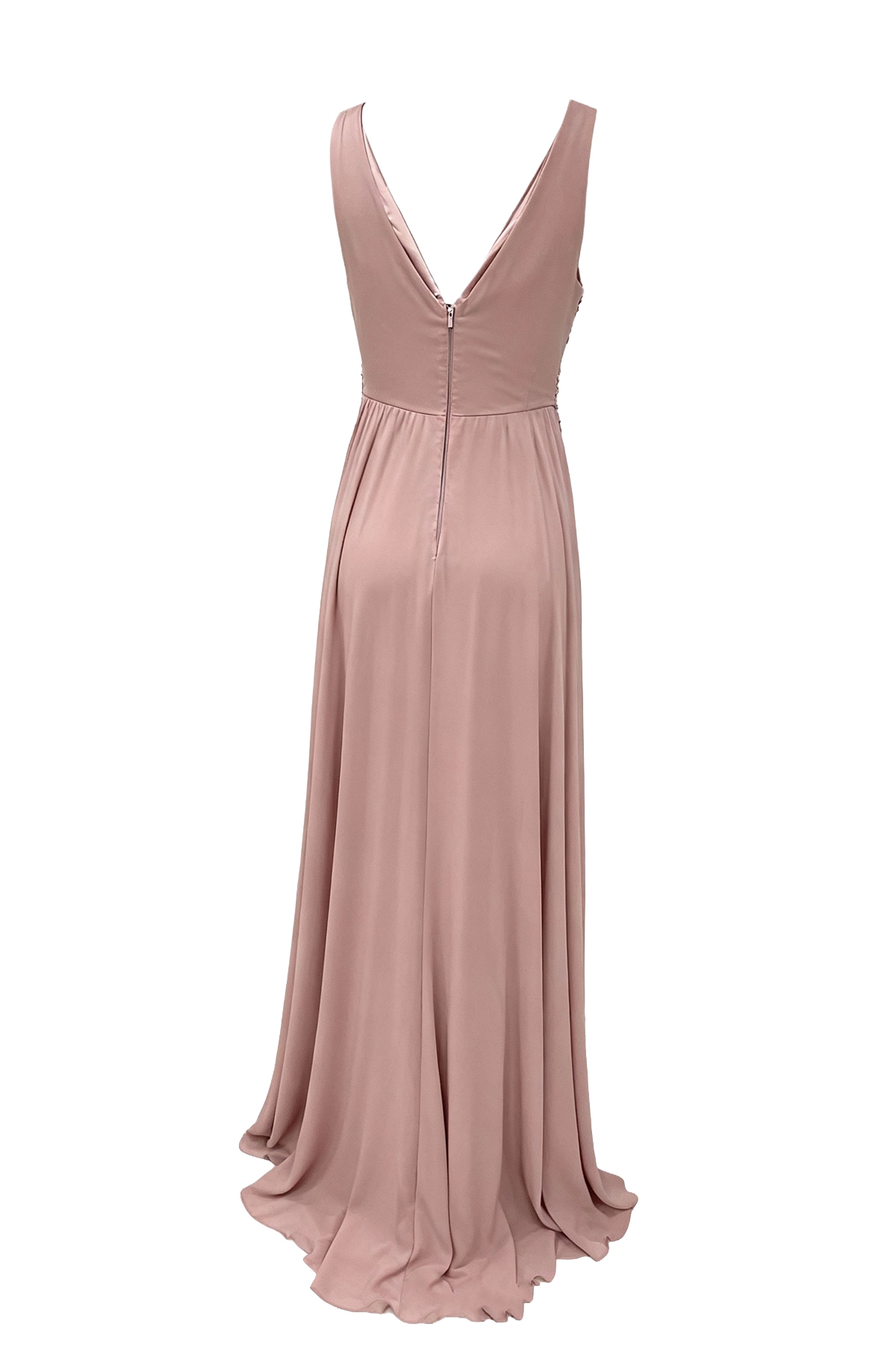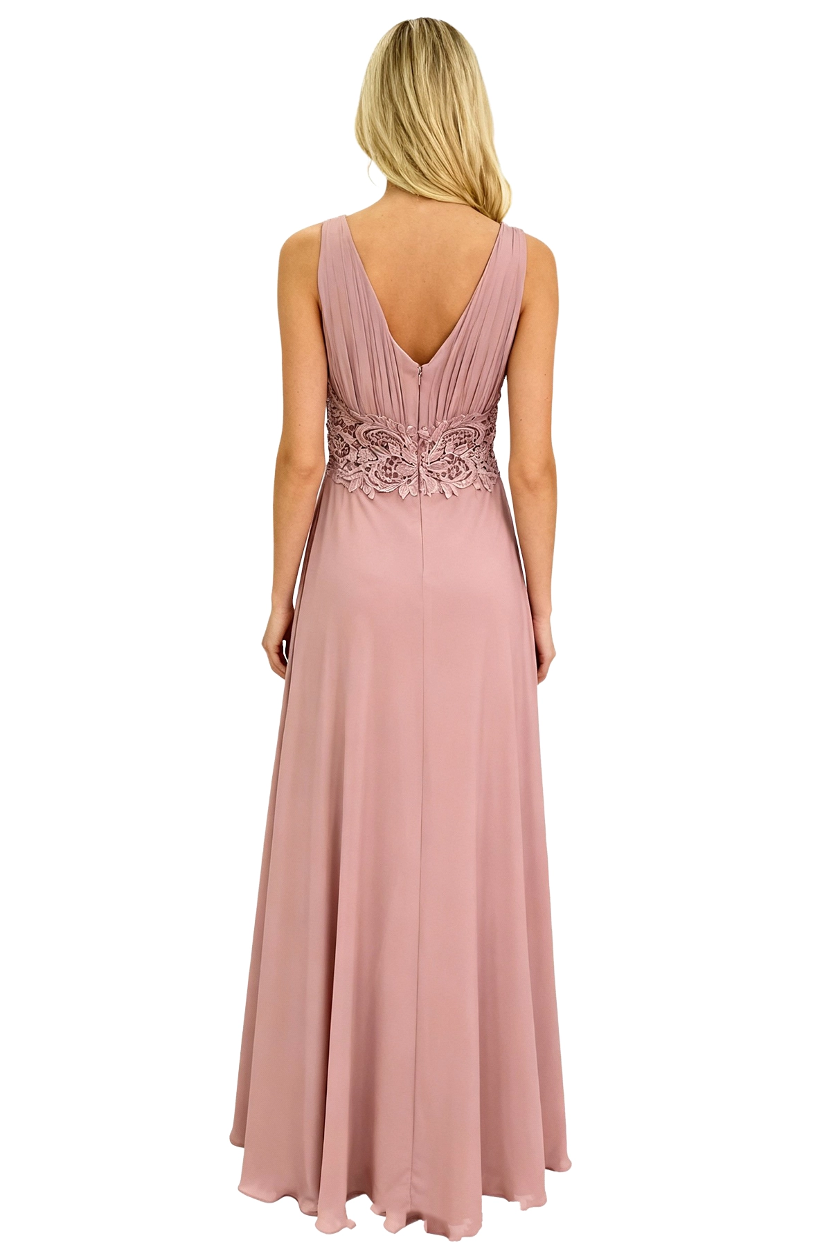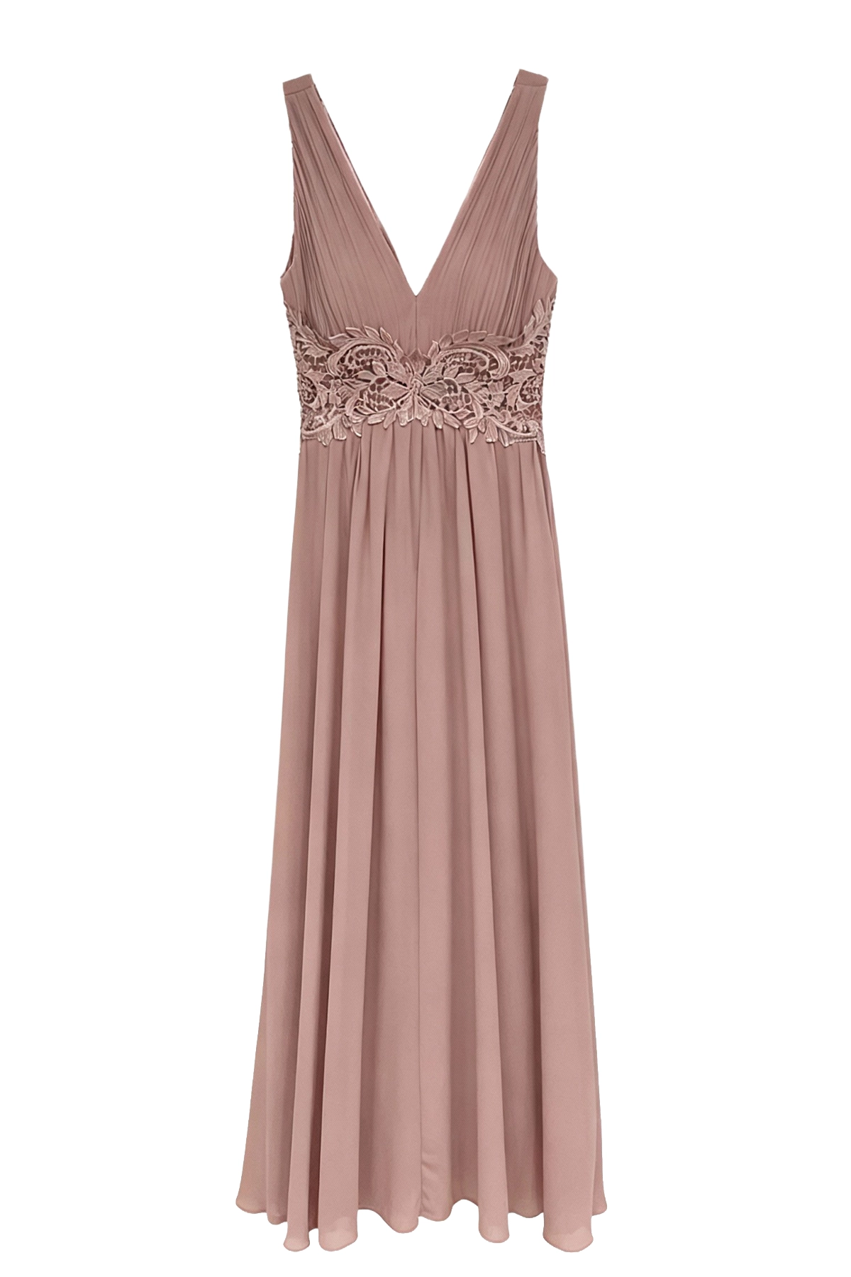Vestido largo rosa palo con encaje en la cintura y escote en V, ideal para invitada de boda o cualquier evento elegante. Su caída fluida y diseño femenino lo convierten en una opción sofisticada y favorecedora.