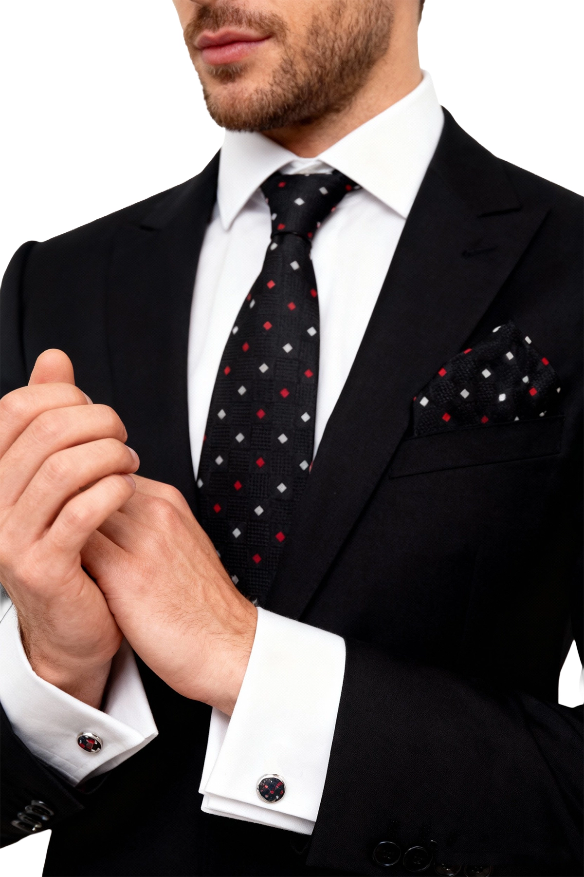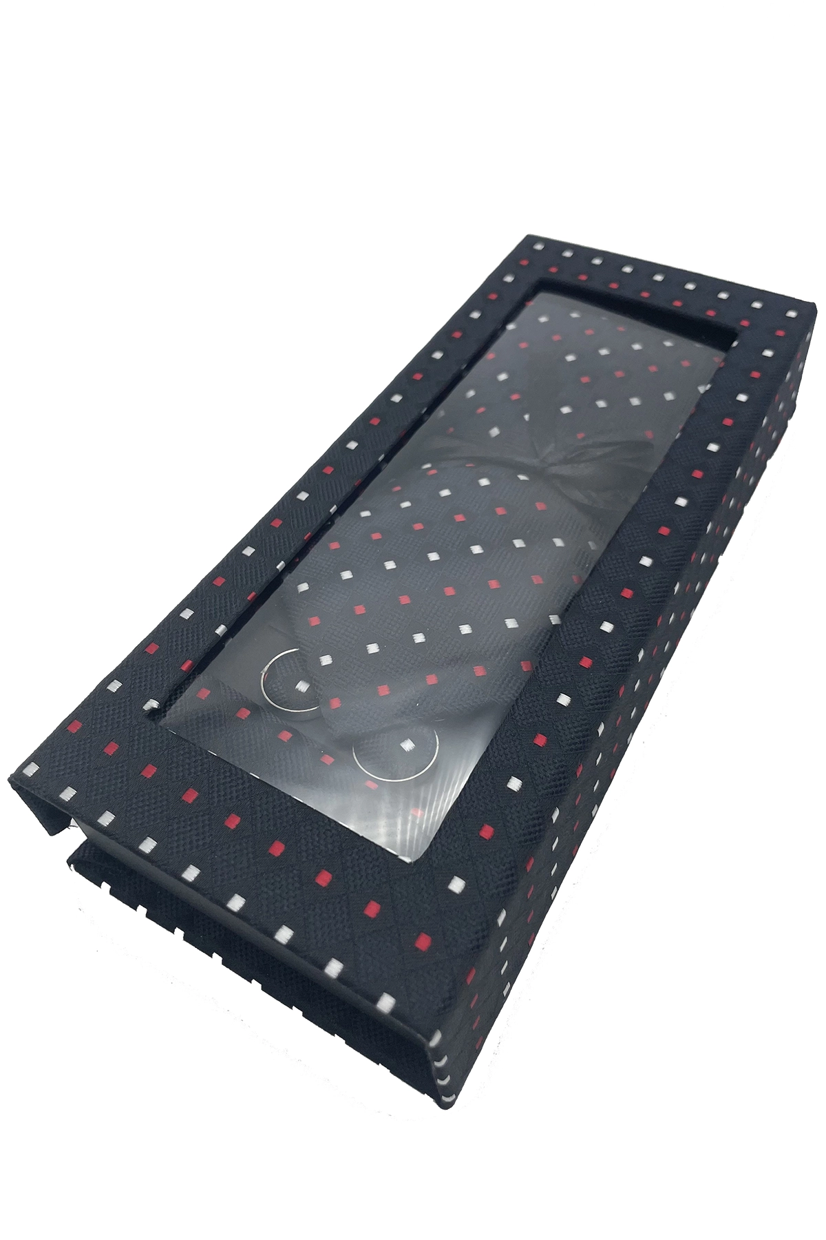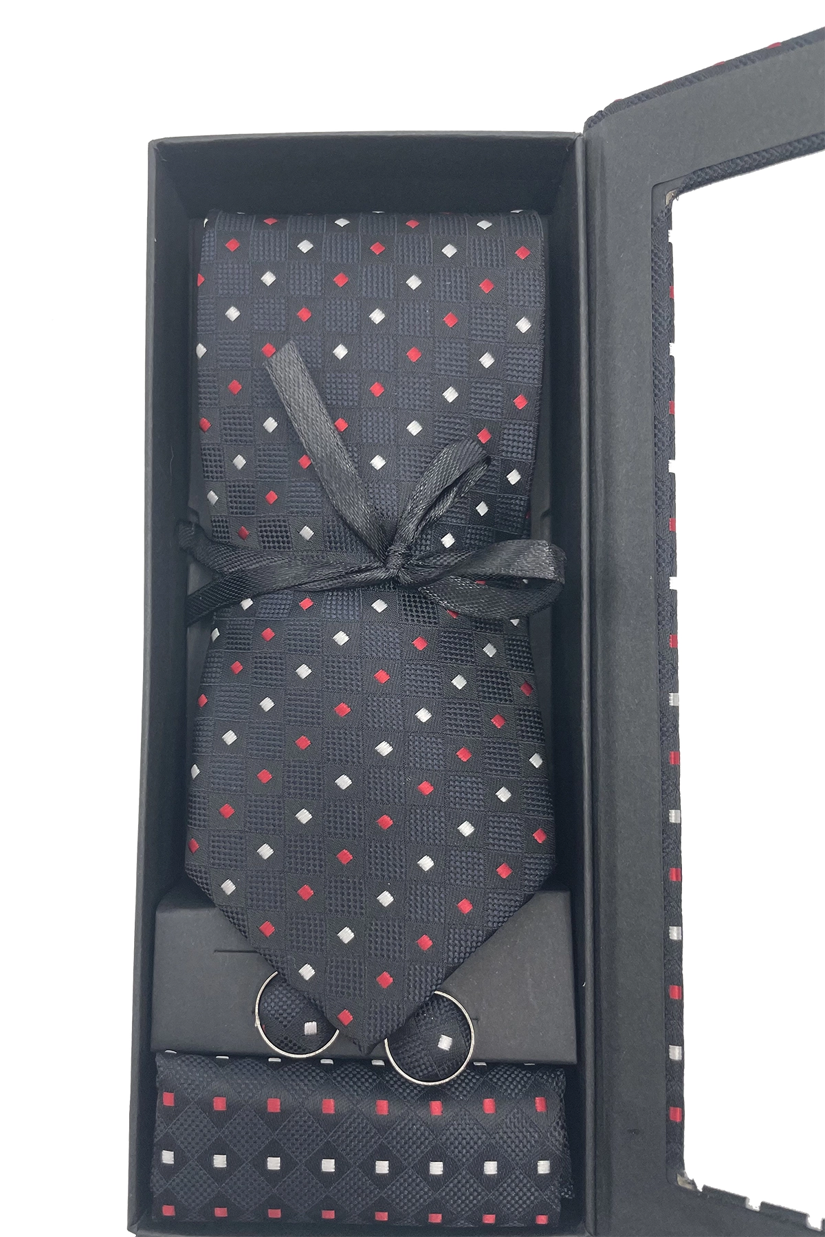 Este elegante pack regalo de corbata, gemelos y pañuelo destaca por su sofisticado diseño en color negro con detalles rojos y plateados, creando un estilo moderno y llamativo perfecto para cualquier ocasión especial. La corbata, elaborada con materiales de alta calidad, presenta un patrón geométrico que aporta un toque distintivo sin perder la elegancia clásica. Su textura suave y su acabado refinado permiten combinarla fácilmente con trajes formales y camisas de distintos tonos. El pañuelo, a juego con el diseño de la corbata, complementa el look con armonía y equilibra el conjunto con un acabado impecable. Los gemelos, en tonos metálicos, completan el set ofreciendo un detalle final sofisticado que eleva cualquier atuendo.