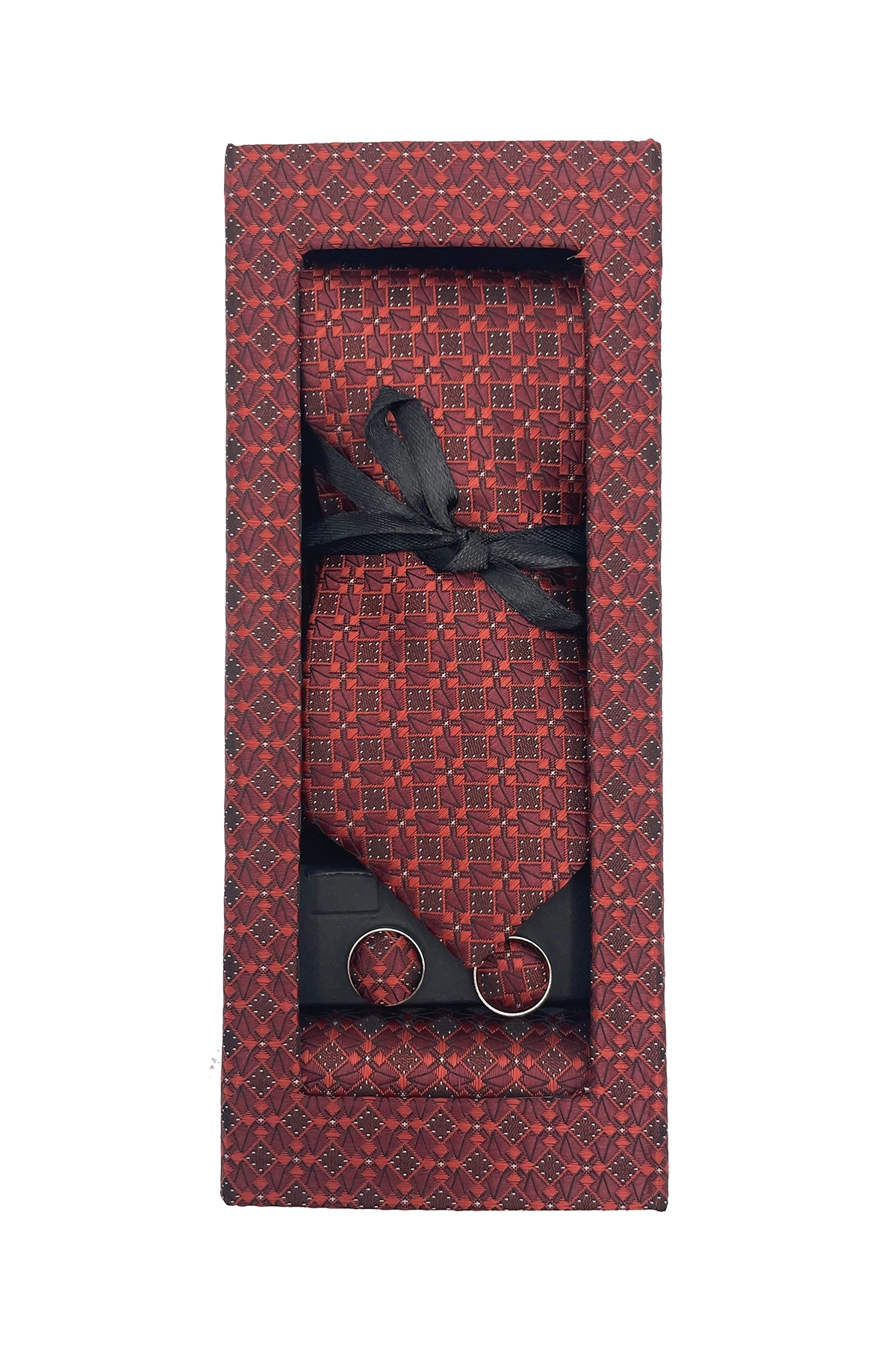Este elegante pack regalo de 3 piezas ha sido diseñado para hombres que buscan complementar su estilo con accesorios de calidad y un toque de distinción. Incluye una corbata, un pañuelo y un par de gemelos, todos perfectamente coordinados en un atractivo diseño geométrico en tonos rojos que aporta sofisticación y personalidad a cualquier conjunto formal.