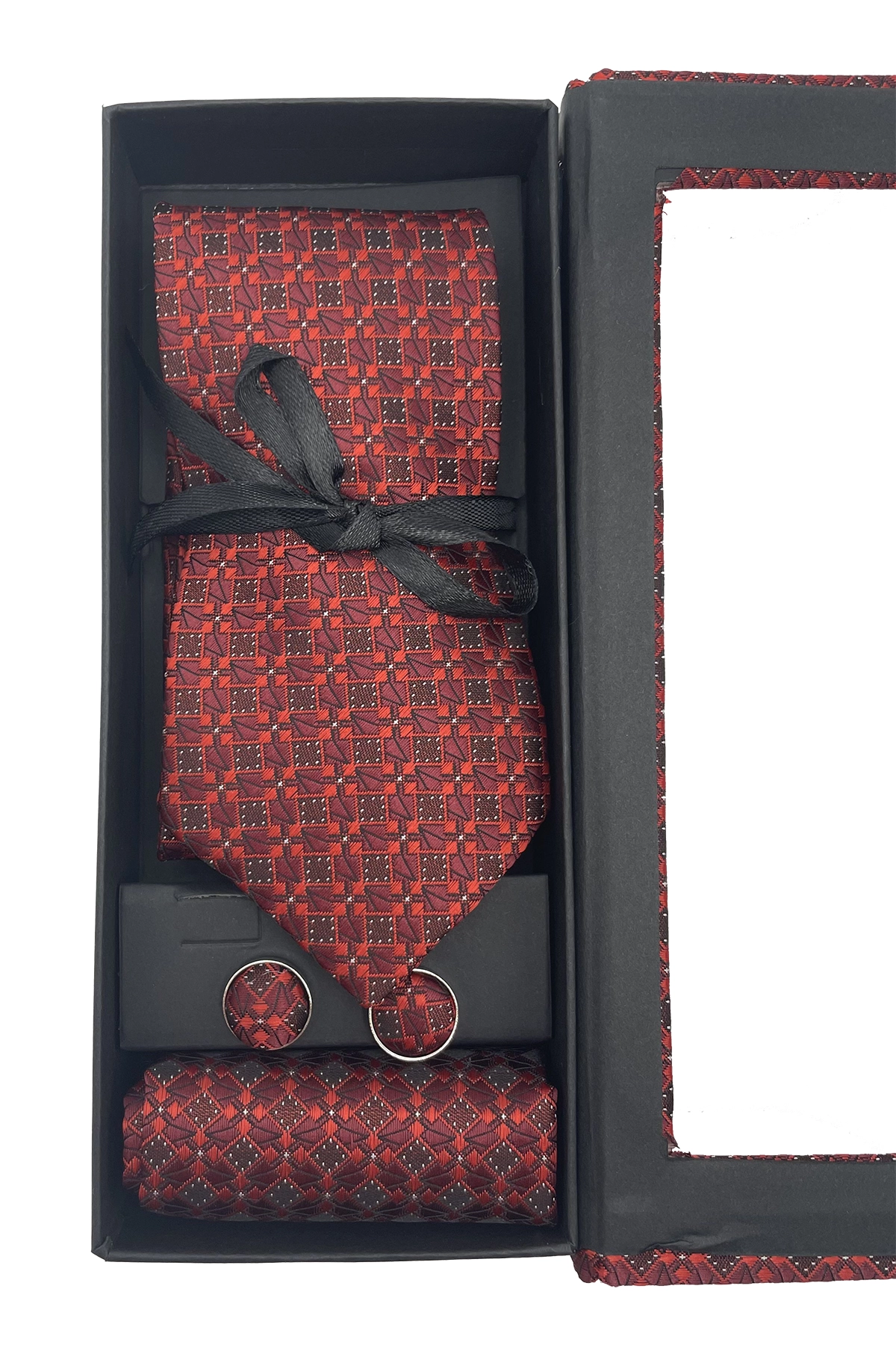 Set de regalo 3 piezas para hombre: corbata, pañuelo y gemelos a juego en elegante diseño rojo. Perfecto para eventos, oficina o regalos especiales. Añade estilo y sofisticación a cualquier look formal.