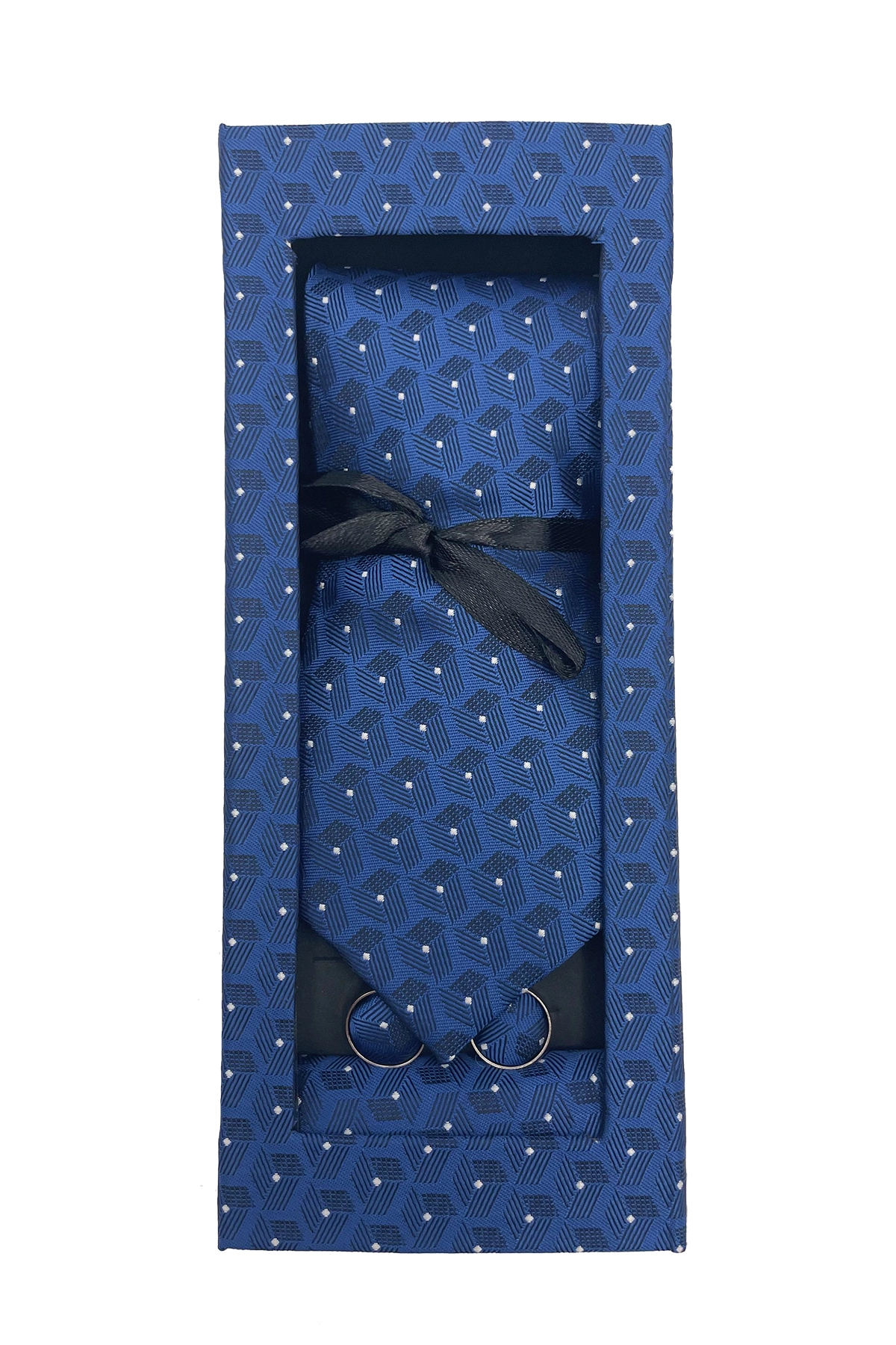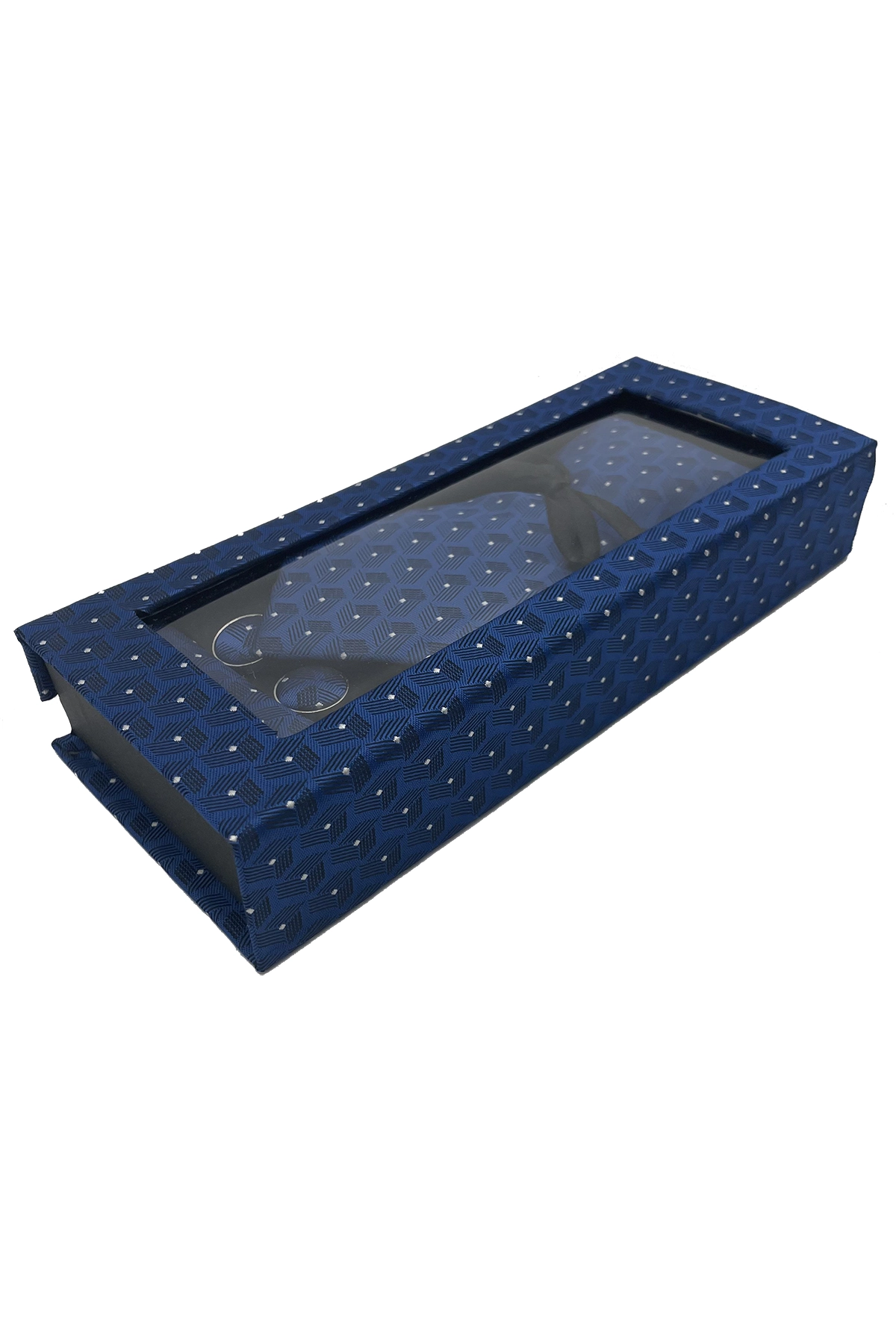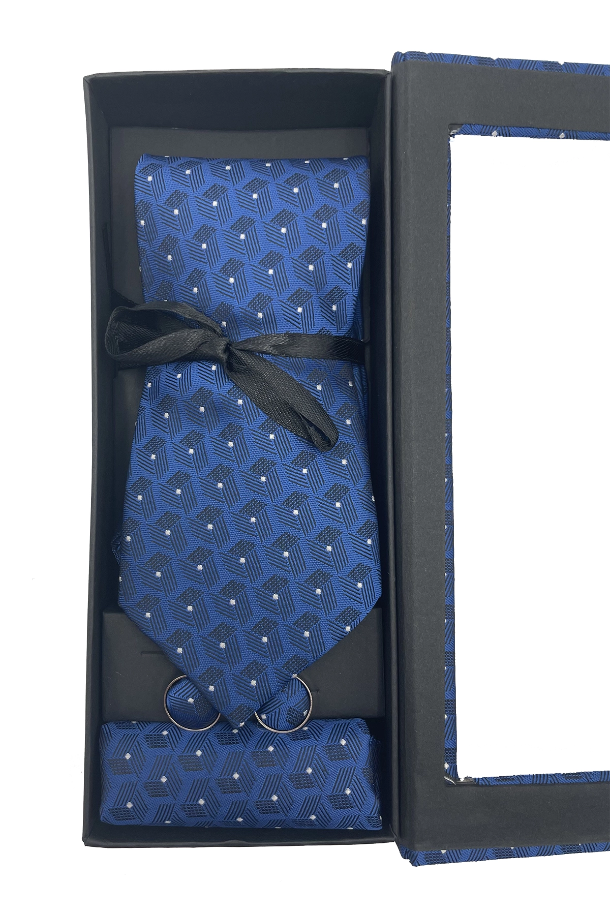 Set de regalo de 3 piezas que incluye corbata, pañuelo y gemelos, todos con un elegante diseño geométrico en tono azul a juego. Ideal para ocasiones formales y como detalle especial