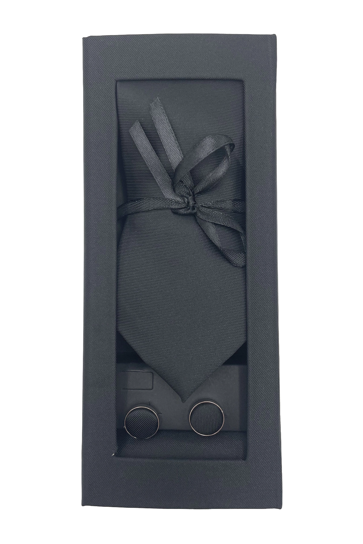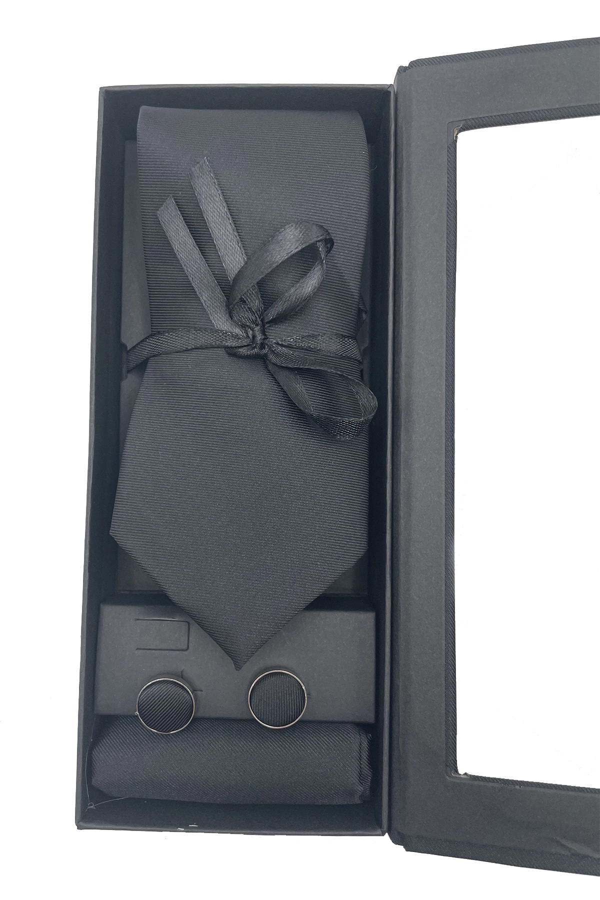 Set de corbata, pañuelo y gemelos en color negro elegante. Un regalo ideal para eventos, bodas, fiestas o para complementar un look formal con estilo y distinción.