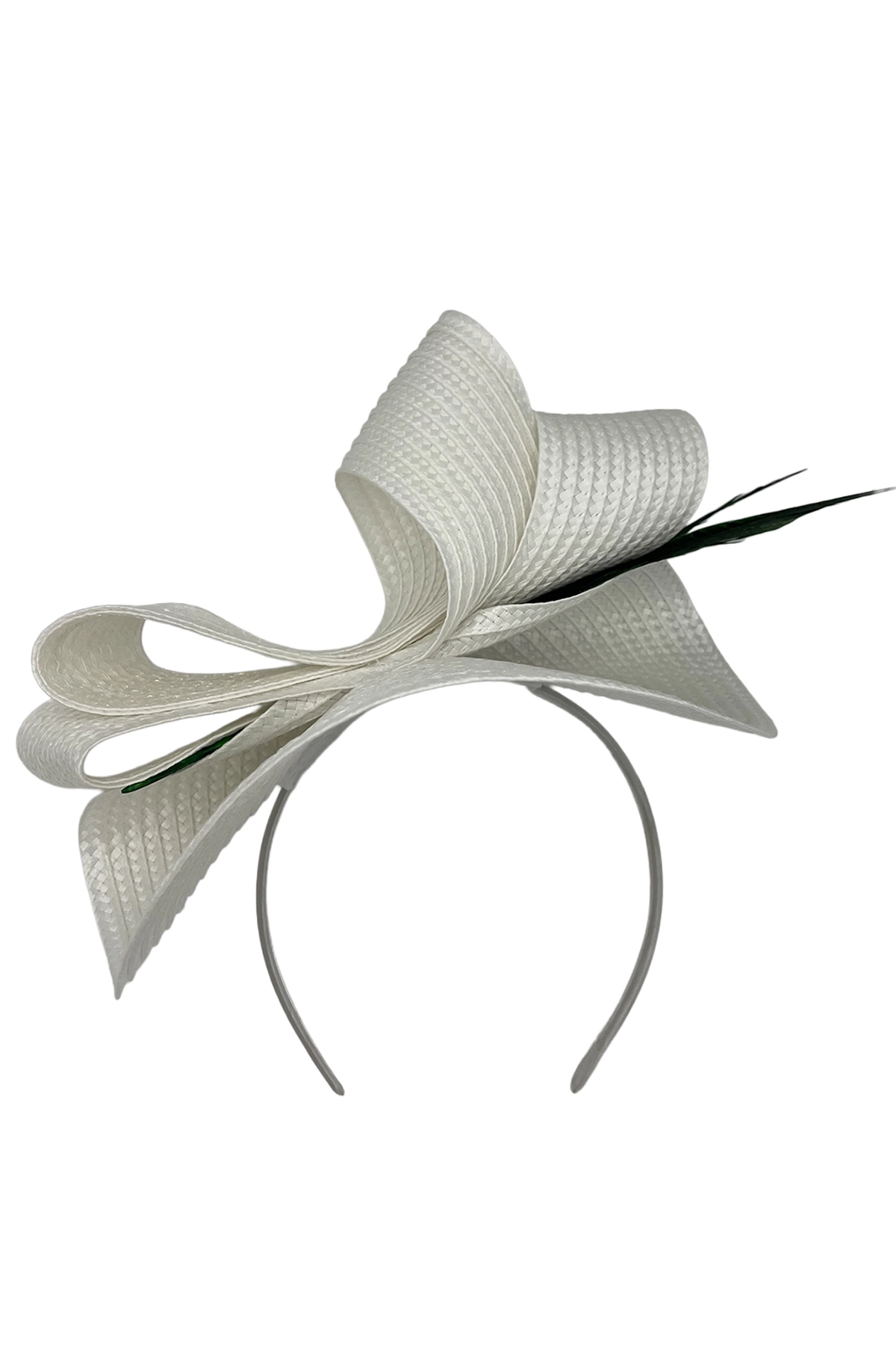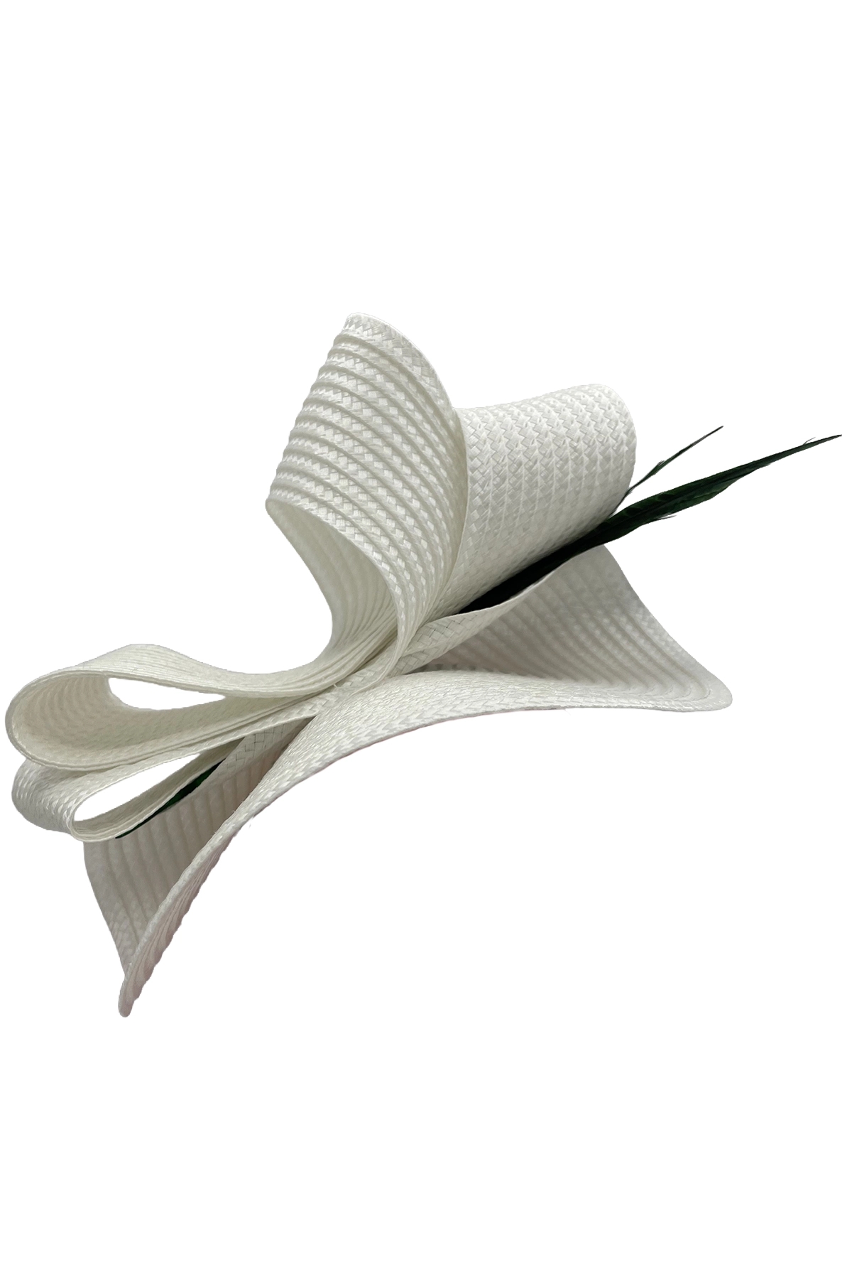 Este sofisticado tocado en color blanco destaca por su diseño escultórico elaborado con finas ondas textiles que aportan volumen, movimiento y un toque moderno. Realzado con delicadas plumas en tono verde oscuro, combina armoniosamente la suavidad de las formas con un detalle natural que añade altura y distinción.