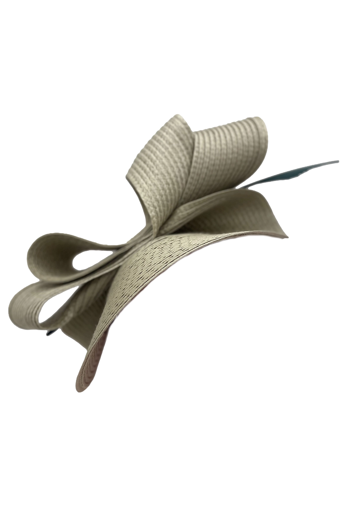 Este accesorio es una joya de la elegancia contemporánea, perfecta para una novia romántica, una invitada distinguida o una madrina con estilo. Su diseño escultórico de lazos entrelazados en rafia natural crea un juego de volúmenes equilibrado y sofisticado. La pluma en tono verde oscuro, fina y sutil, aporta un toque de movimiento y frescura, elevando el conjunto con una delicadeza exquisita.
