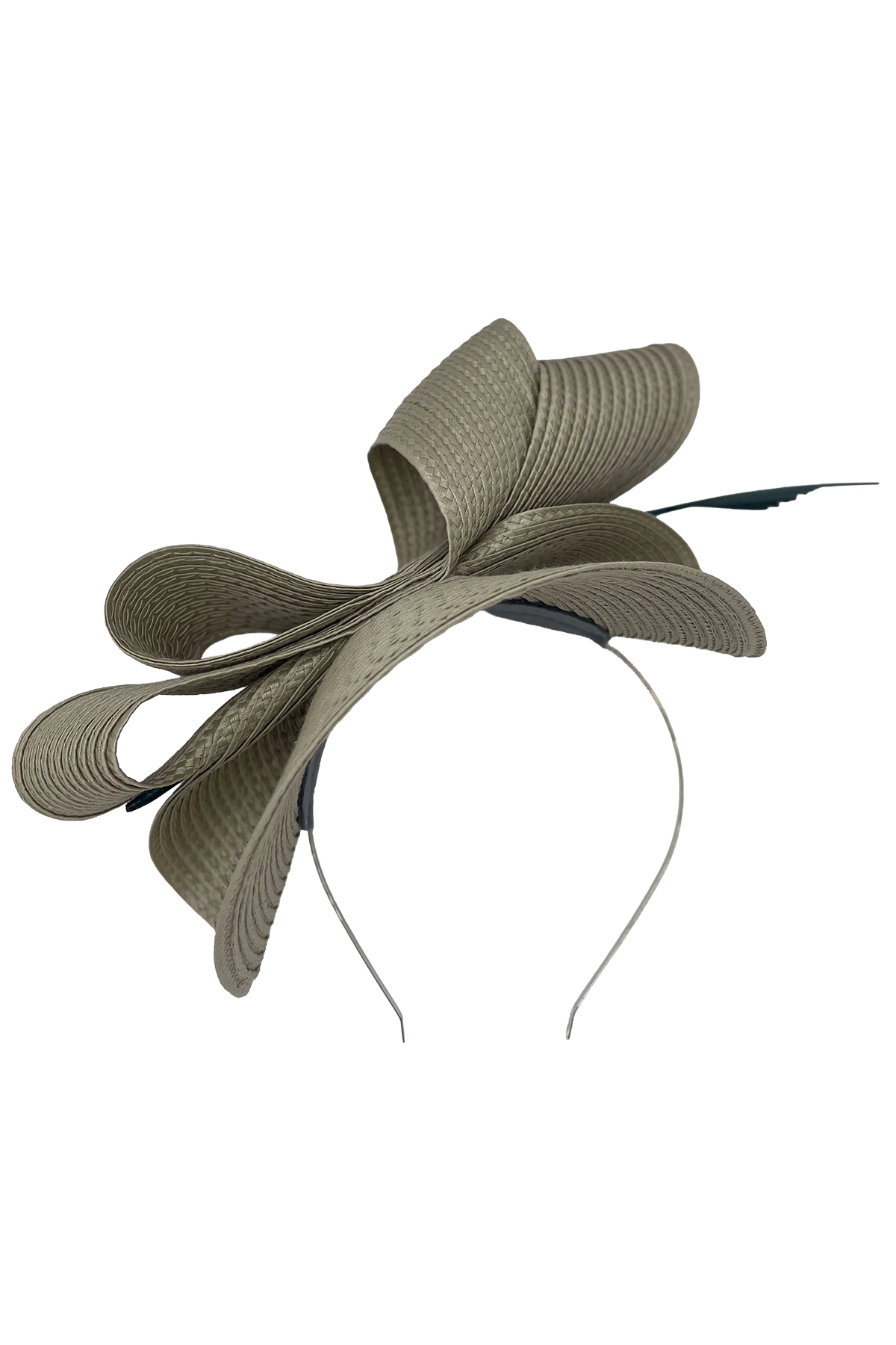 Tocado color plata con diseño de lazos trenzados y plumas, elegante y moderno, ideal para bodas, fiestas o invitadas sofisticadas