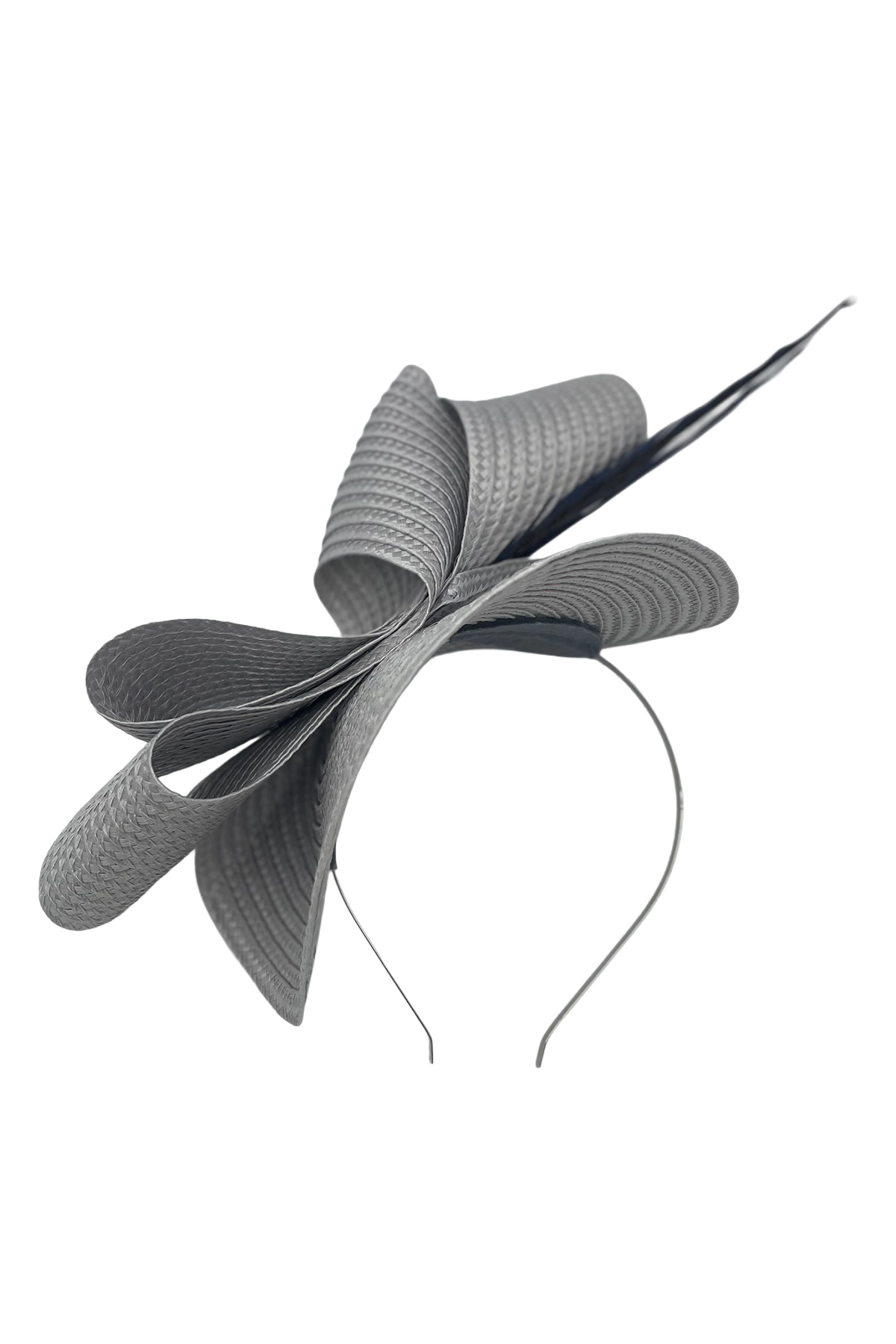 Tocado color plata con diseño de lazos trenzados y plumas, elegante y moderno, ideal para bodas, fiestas o invitadas sofisticadas
