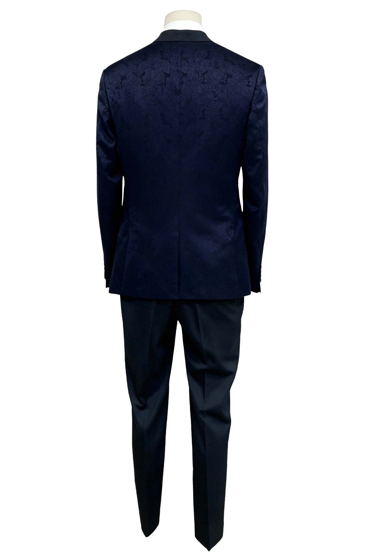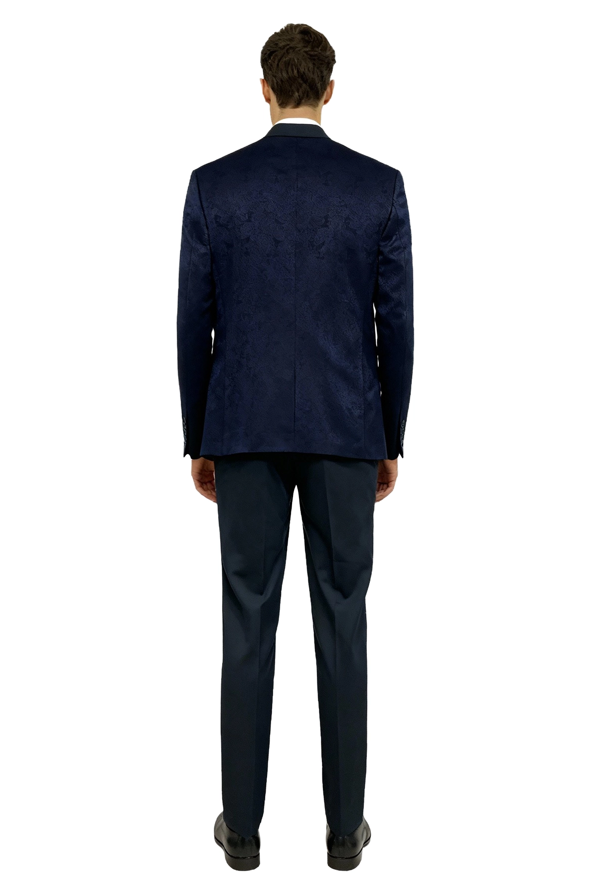 Traje de novio con brocado azul marino modelo Luis, elegante y sofisticado, ideal para bodas y eventos formales gracias a su diseño moderno y acabado distintivo.