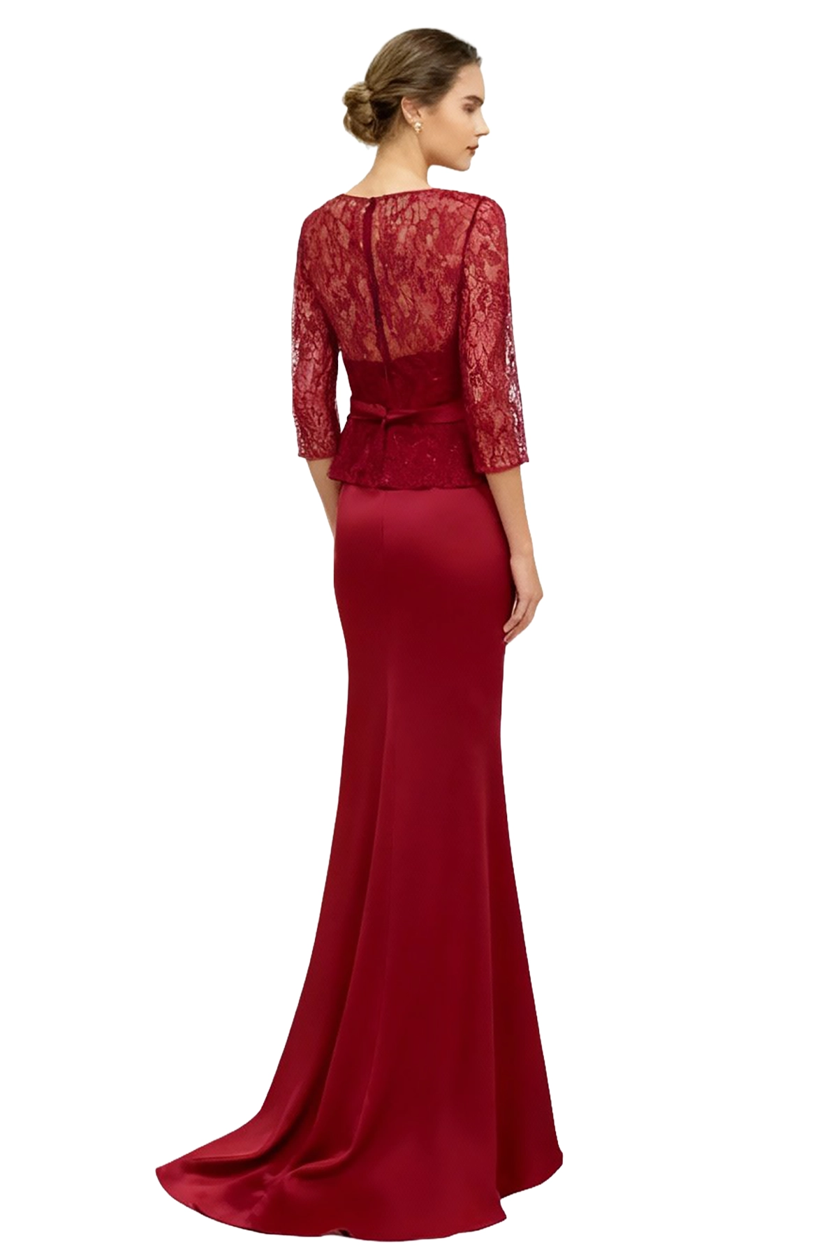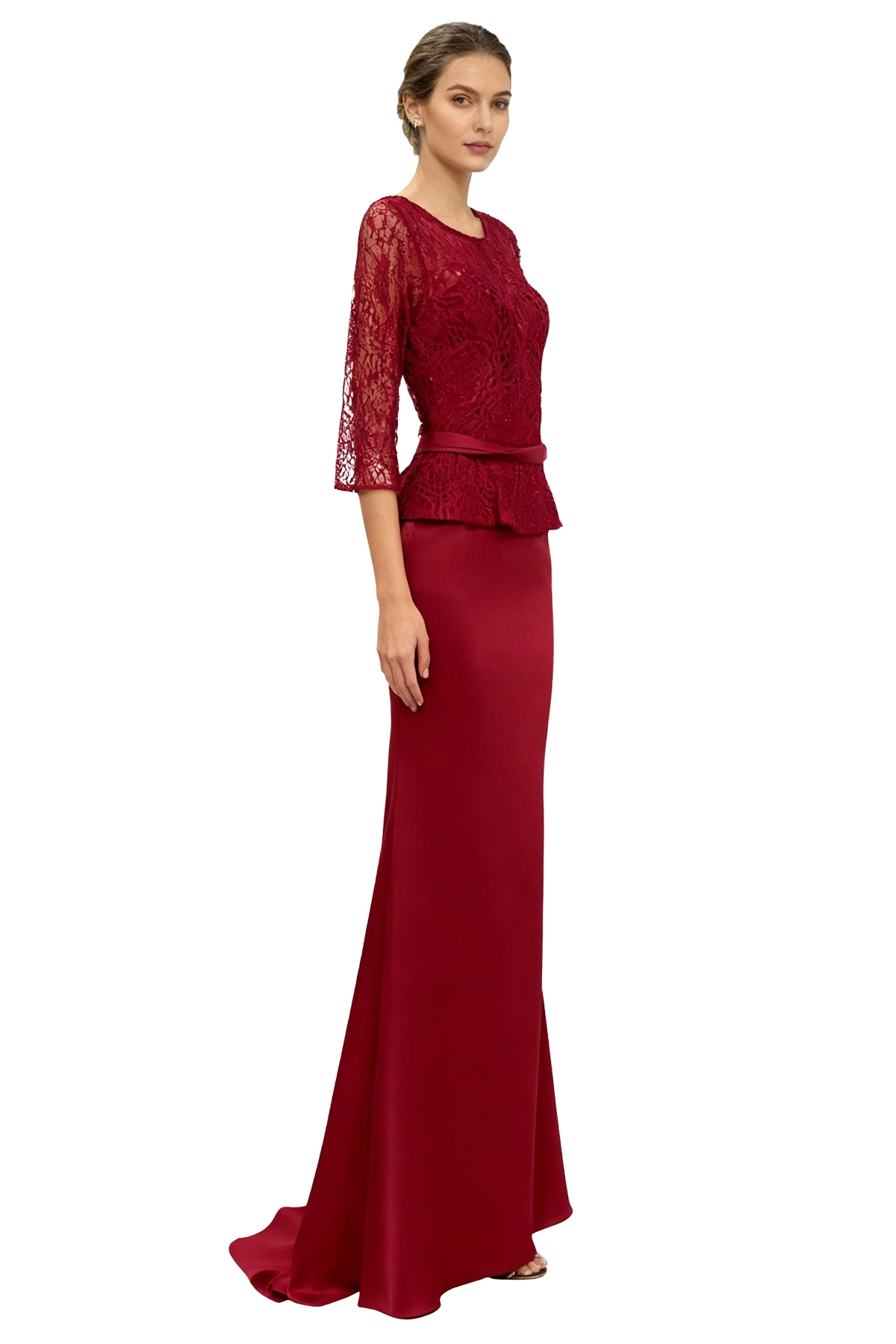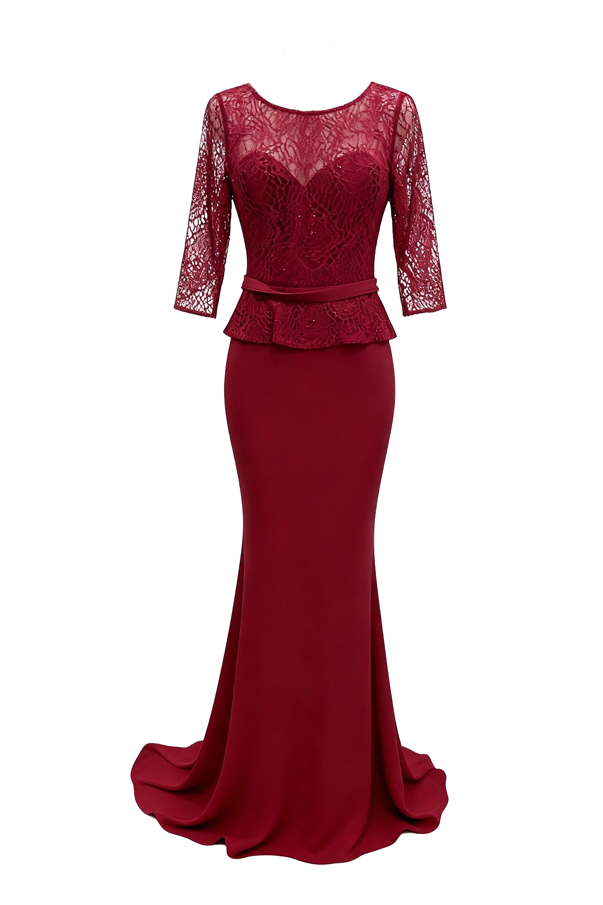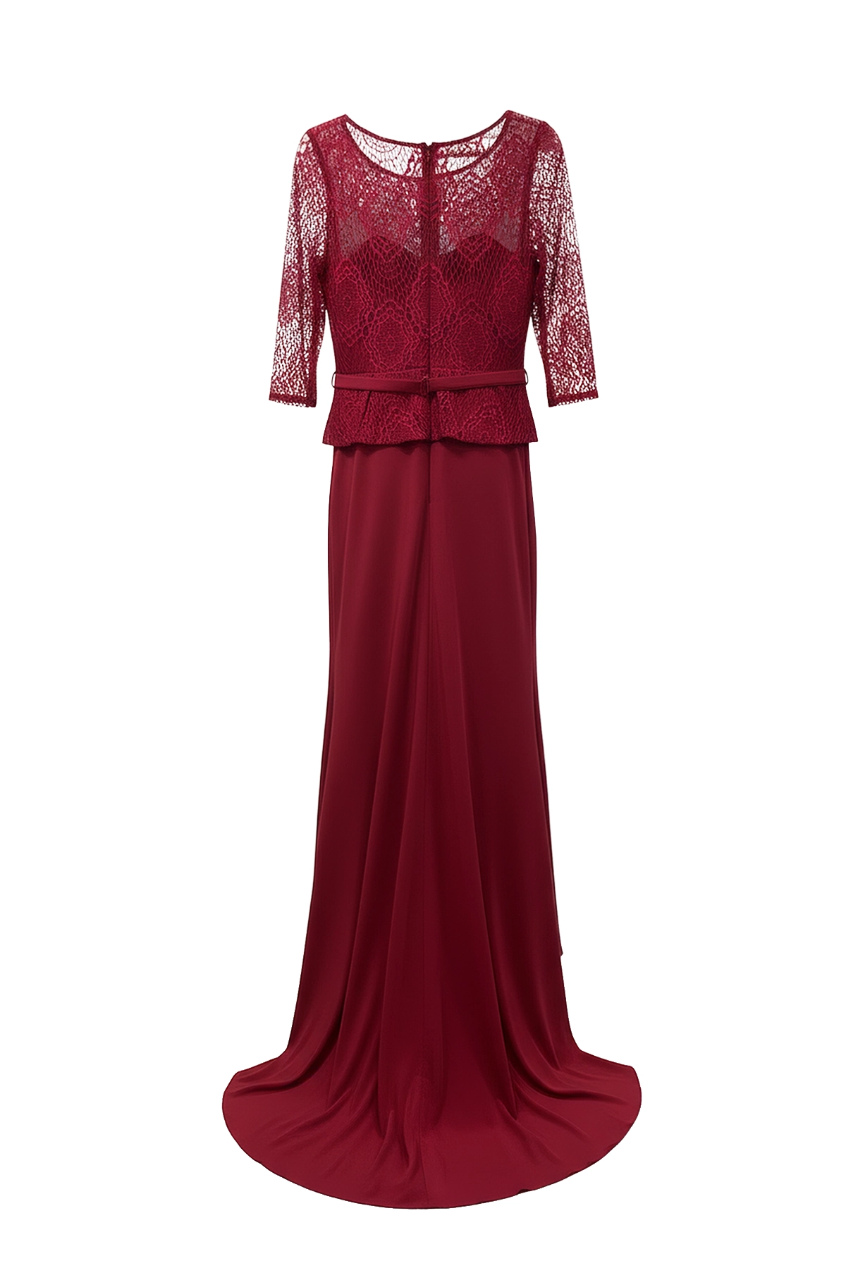 Elegante vestido largo color fucsia con cuerpo de encaje y falda fluida. Diseño sofisticado con mangas francesas y detalle peplum, ideal para bodas, fiestas y eventos especiales.