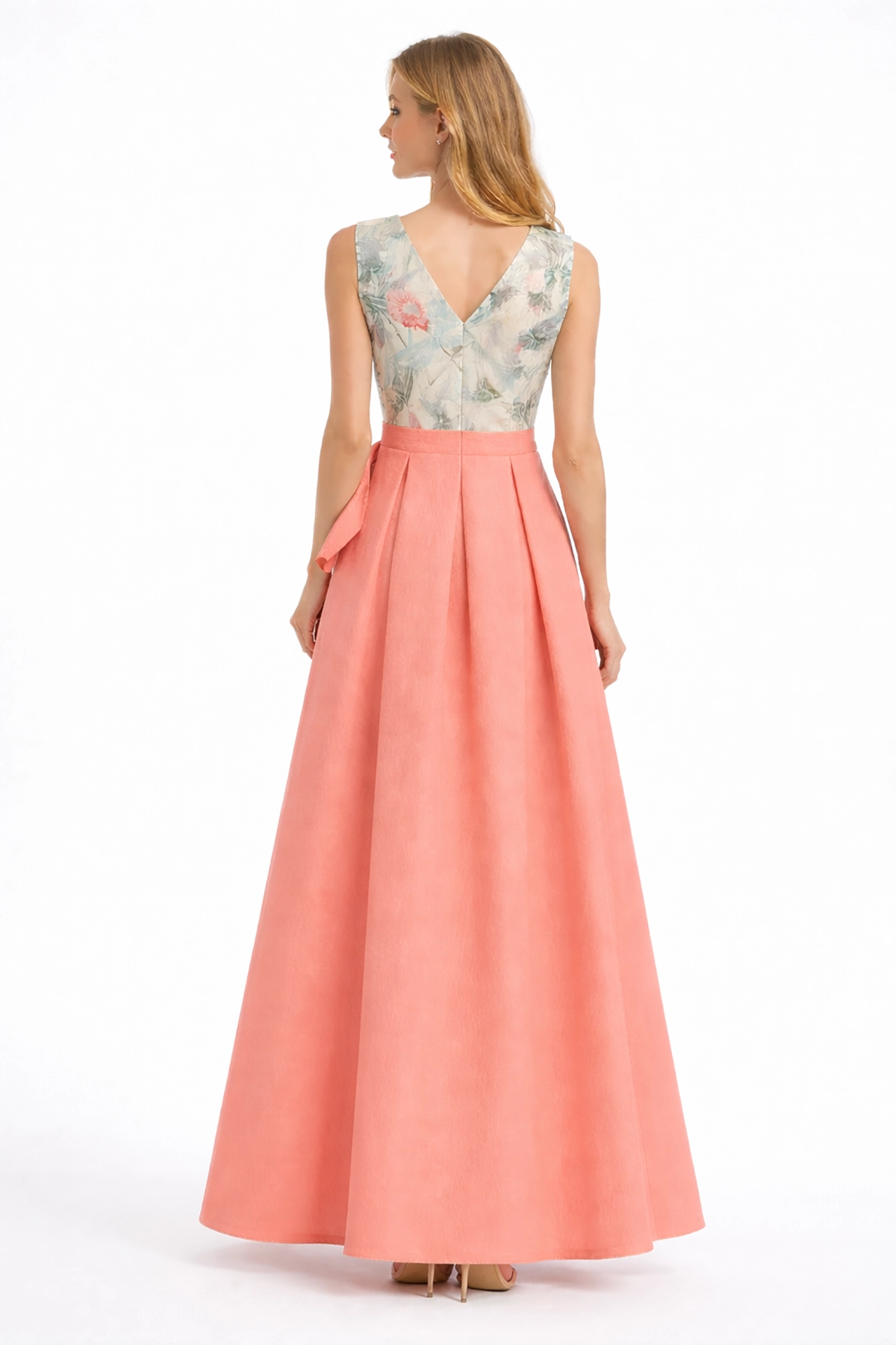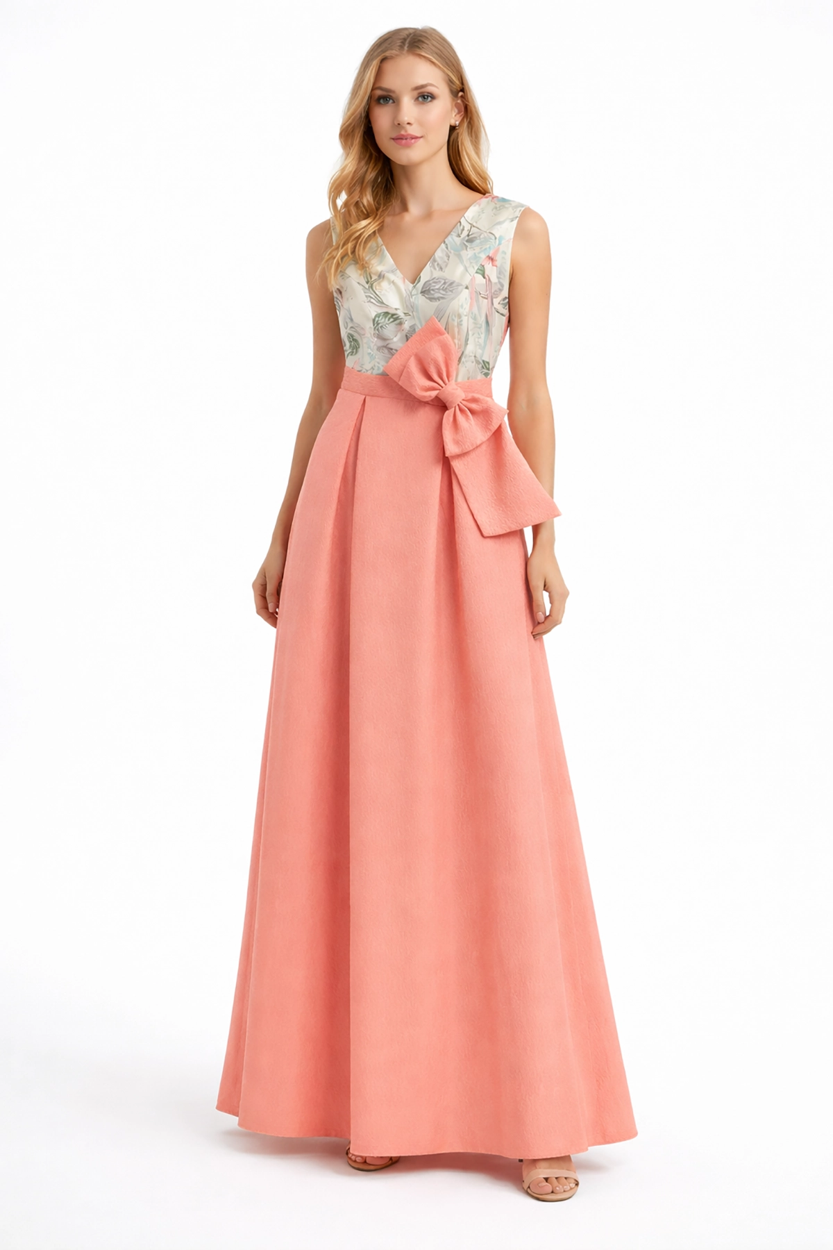 Vestido largo elegante en tono coral, con falda fluida y lazo decorativo en la cintura que realza la silueta. El cuerpo presenta un delicado estampado floral con escote en pico, ideal para eventos especiales o celebraciones.
