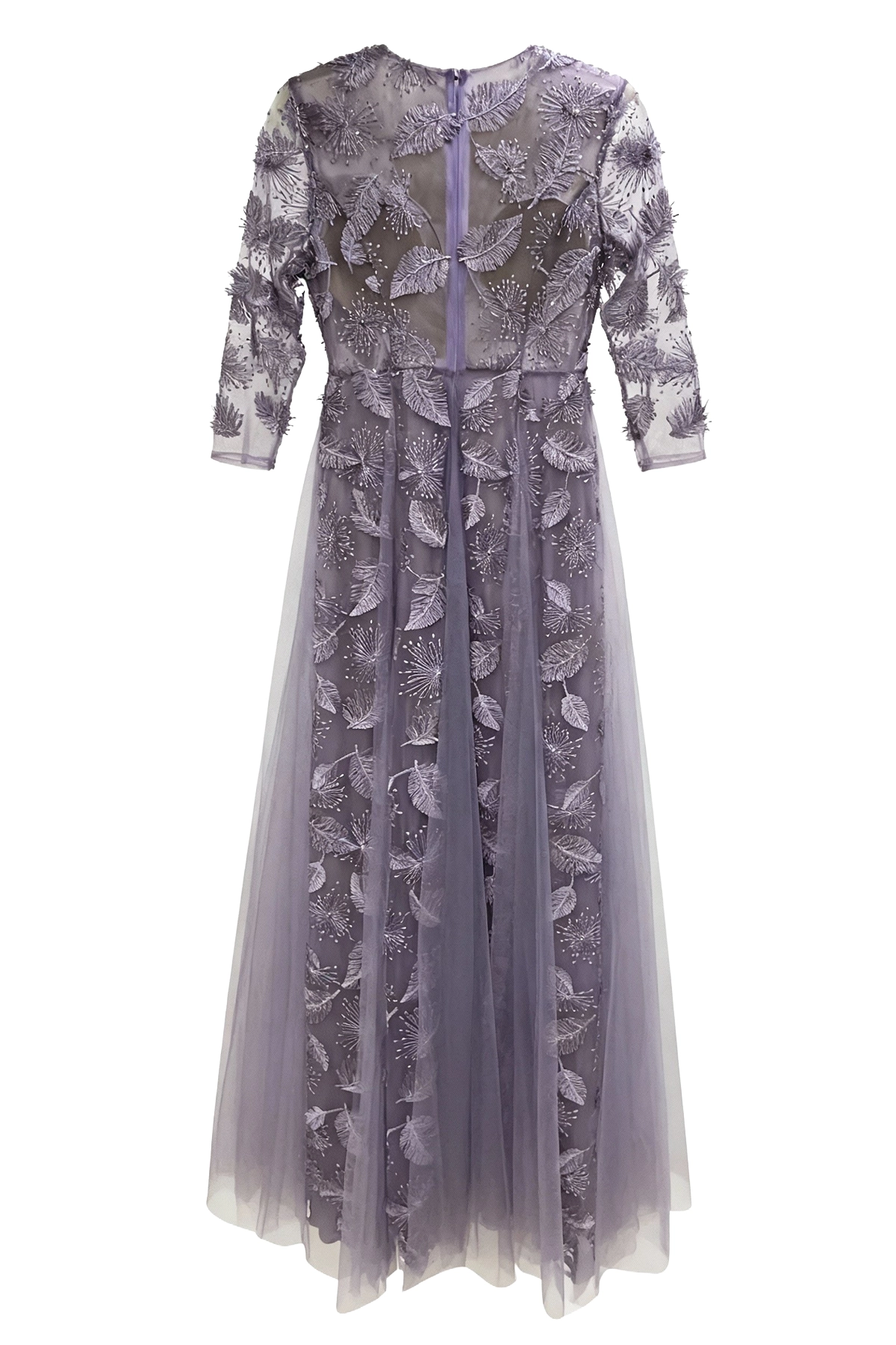 Vestido largo lila con encaje floral y falda de tul, ideal para eventos elegantes. Diseño con escote profundo y mangas tres cuartos que aportan sofisticación y delicadeza.